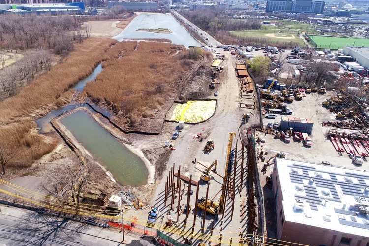 The new block runs through the site of the former Flushing Airport, which is now an undeveloped wetland, and the project includes the restoration of 12 acres of the remaining wetland. The restored wetlands will provide a habitat for wildlife, protect against floods, and filter toxins from water draining into Mill Creek and Flushing Bay.