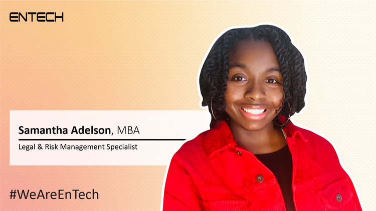 EnTech is excited to announce that Samantha Adelson has been promoted to Legal & Risk Management Specialist. In this role she is responsible for a wide range of legal and risk management strategies, including reviewing contracts and estimating risk exposure to protect and advance the company’s growth strategy risks. Samantha also researches and evaluates potential new markets and business expansion opportunities, and she leads complex negotiation strategies related to company standards. Among Samantha’s current and past projects have been obtaining licenses required to set up a California branch office; obtaining licenses for EnTech to work in Maryland, Virginia, and Ohio; and expanding EnTech’s WBE certification with new states, counties, and agencies.