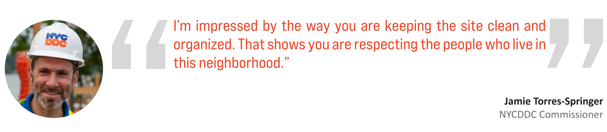 The Liriano/EnTech JV is providing services required for the inspection, management, coordination, and administration of the project. Mr. Torres-Springer was impressed by the quality of service provided by the REI team and commended the team for the safety of the project site. “I’m impressed by the way you are keeping the site clean and organized,” he said. “That shows you are respecting the people who live in this neighborhood.”